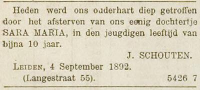 In het jaar een duizend acht honderd twee en negentig den vijfden der maand September zijn voor ons Ambtenaar van den Burgerlijken Stand der gemeente Leiden verschenen: Johannes Jacobus de Vlaam oud vier en veertig jaren, aanspreker wonende te Leiden en Adrianus Niehot, oud drie en zestig jaren, sjouwerman, wonende te Leiden, welke ons verklaard hebben dat op den vierden September achttien honderd twee en negentig voormiddigs te zeven uren, binnen deze gemeente overleden is: Sara Maria Schouten oud negen jaren geboren te Leiden gewoond hebbende te Leiden, dochter van Jacobus Schouten, stucadoor en Mina Laman zonder beroep beiden wonende te Leiden. En is deze akte na gedane voorlezing door ons en de declaranten geteekend.